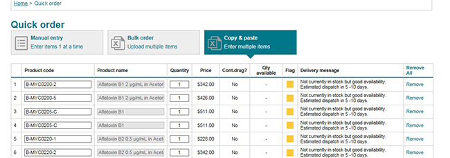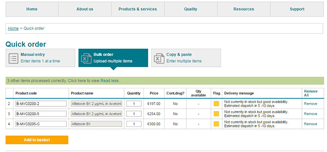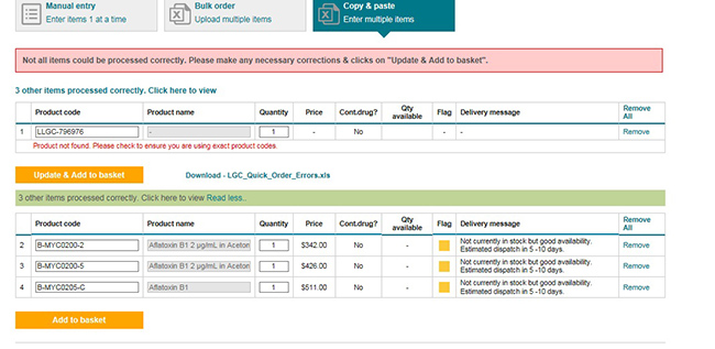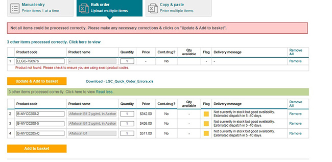 - If any parts have errors or cannot be added to the basket then a status will be provided against each part with an error, giving the user the option of removing item or order.