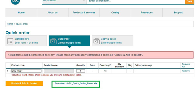 - To download parts with issues in CSV, click on the file or right mouse button click ‘Save As’ on link [LGC Quick Order Errors.xls].